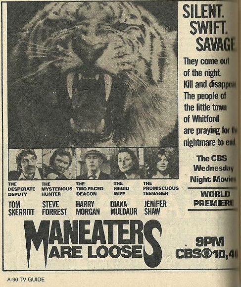 Maneaters Are Loose! premiered on May 3, 1978. Man-eating tigers terrorize a small California town! Star Trek‘s and Star Trek: TNG‘s Diana Muldaur plays “the frigid wife.”