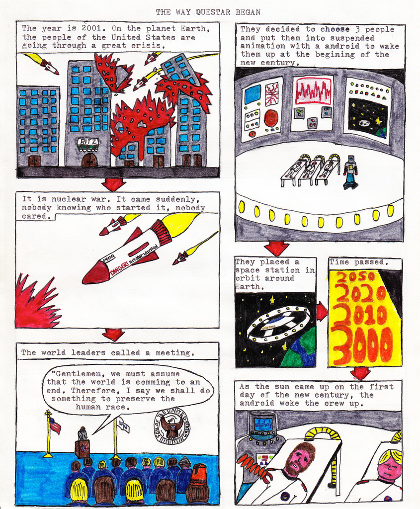 2W2N: I can’t remember if I saw Bakshi’s Lord of the Rings before or after I started reading Tolkein’s books, but LoTR is definitely how I got into D&D as well. Your modules are incredibly sophisticated and accomplished, especially considering you were about 13 when you made them. Do you remember how long it took you to finish them? Did you get to play them with your friends? You also wrote and drew an entire sci-fi comic book, Questar, when you were even younger. All the text is typewritten!
