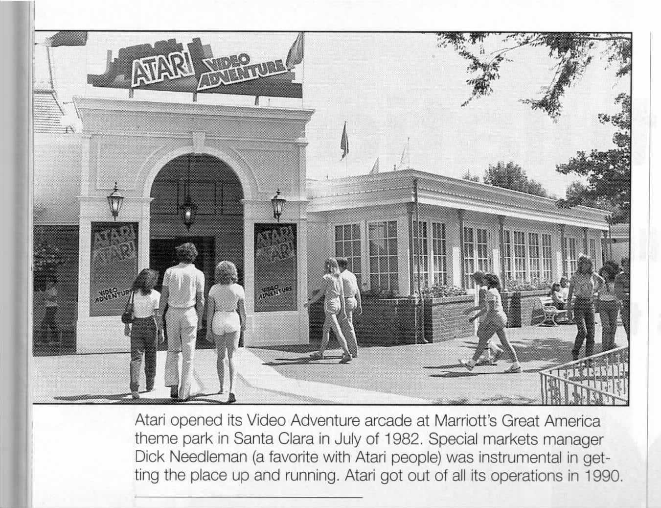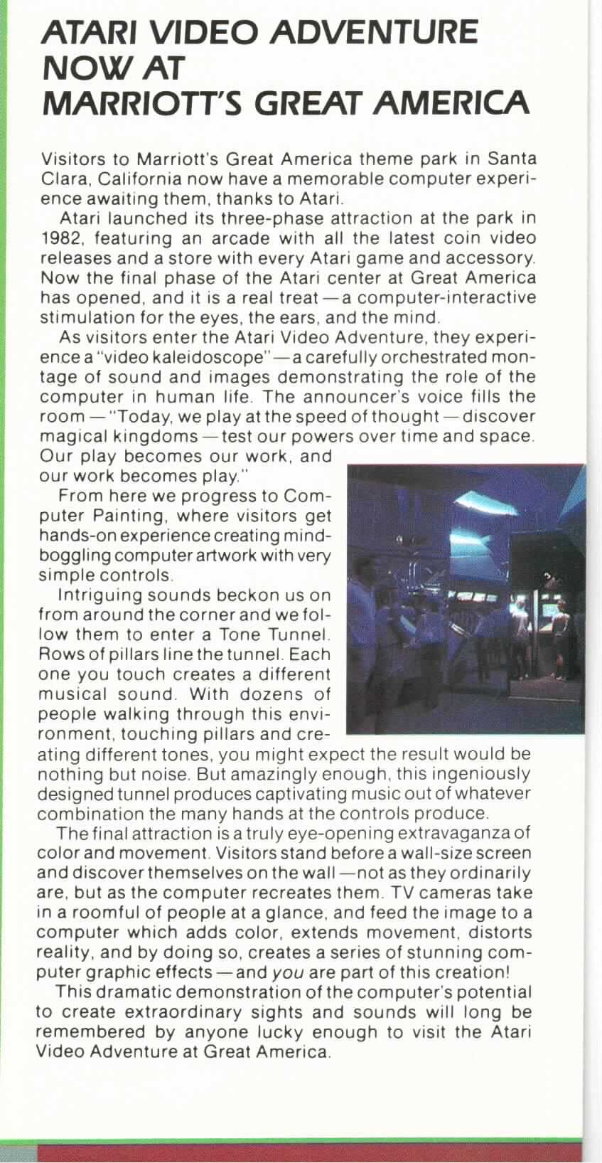Atari Video Adventure, “the premier showcase for the newest innovations in computer learning and video excitement,” was a multi-stage attraction at Marriott’s Great America amusement park in Santa Clara, California. It opened in July 1982 and was completed in 1983. The photo is from a 1997 RePlay Magazine scan provided by Michael Current. (Current’s site is the most comprehensive web-based historical resource on Atari.) Here’s a description and walk-through, also via Current.