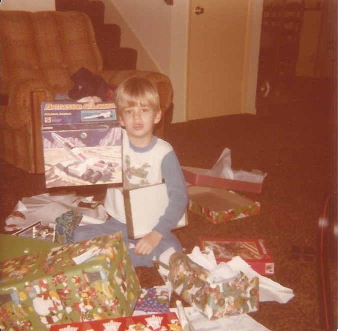 Yours truly, aged six, holding the triple-missile-firing Colonial Scarab. I had the original Viper and Cylon Raider too, before they were reissued with non-firing missiles.