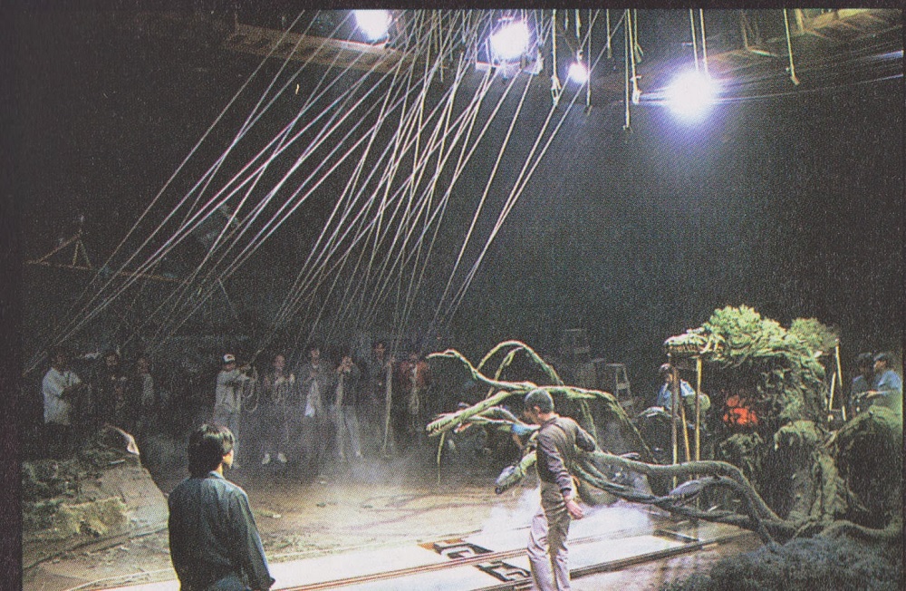 Top: effects technicians prepare to operate the multitude of wires used to animate Biollante’s tentacles. Bottom: action sequence from Godzilla vs. Biollante, 1989.