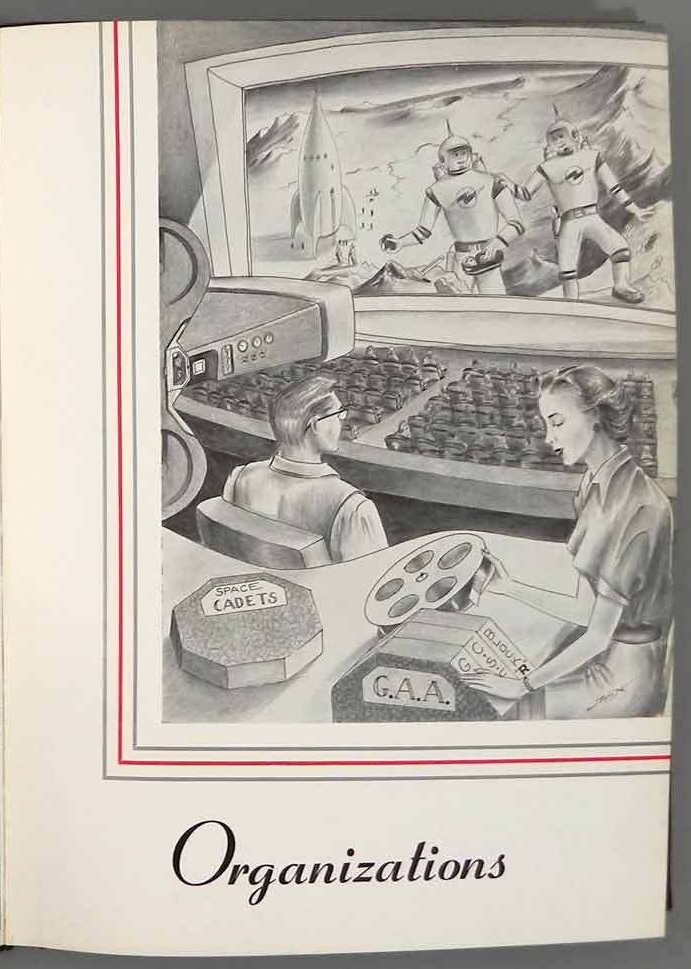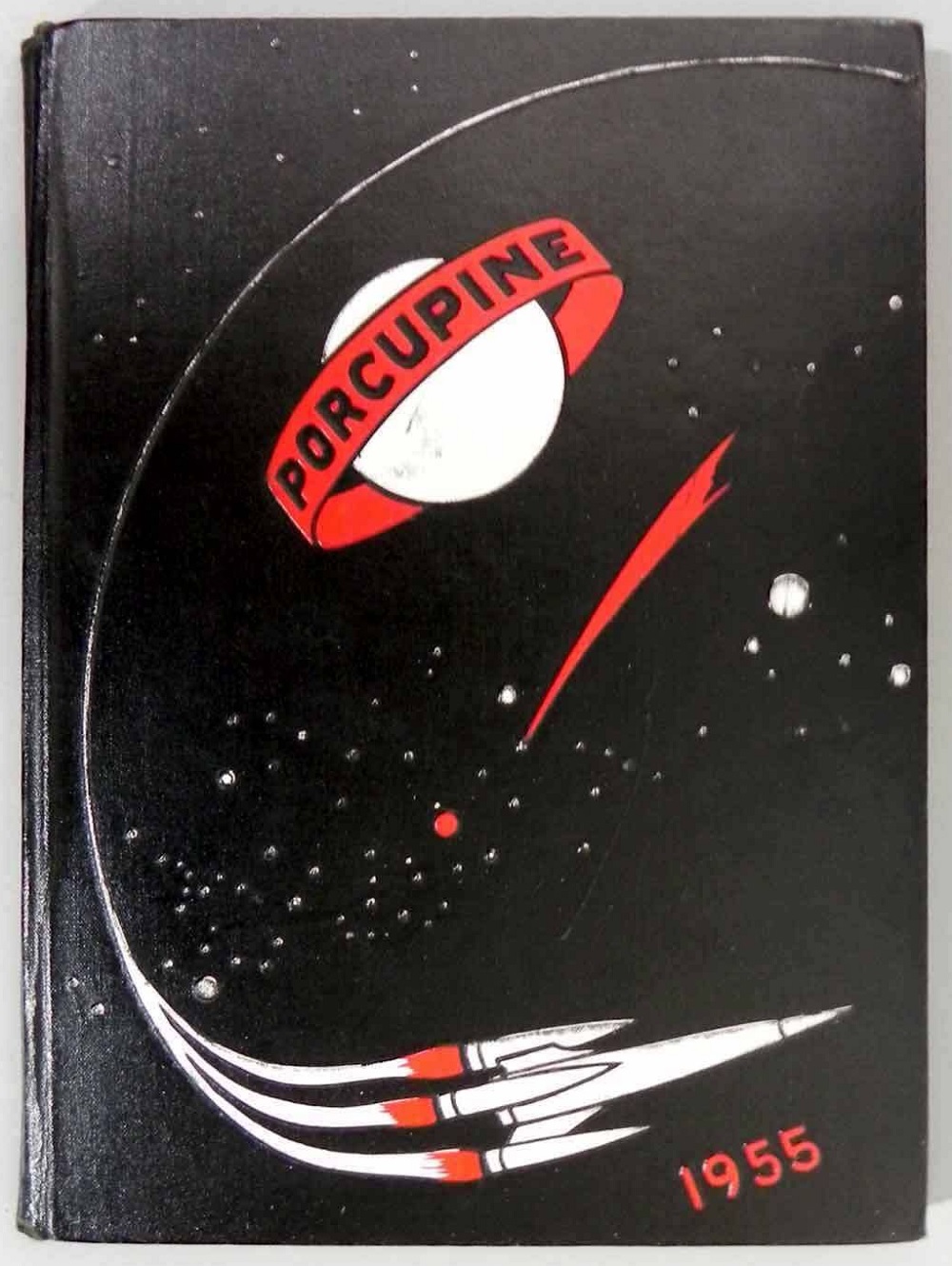 Reedley High School (public) is in Fresno County, California. The illustrations are gorgeous, and telling. Historians generally cite 1955 as the year the Space Race began, and the phrase “flying saucer” dates to 1947 (“UFO” was officially adopted by the U.S. Air Force in 1952). The futuristic Reedley is a great example of the Mid-Century modern aesthetic.