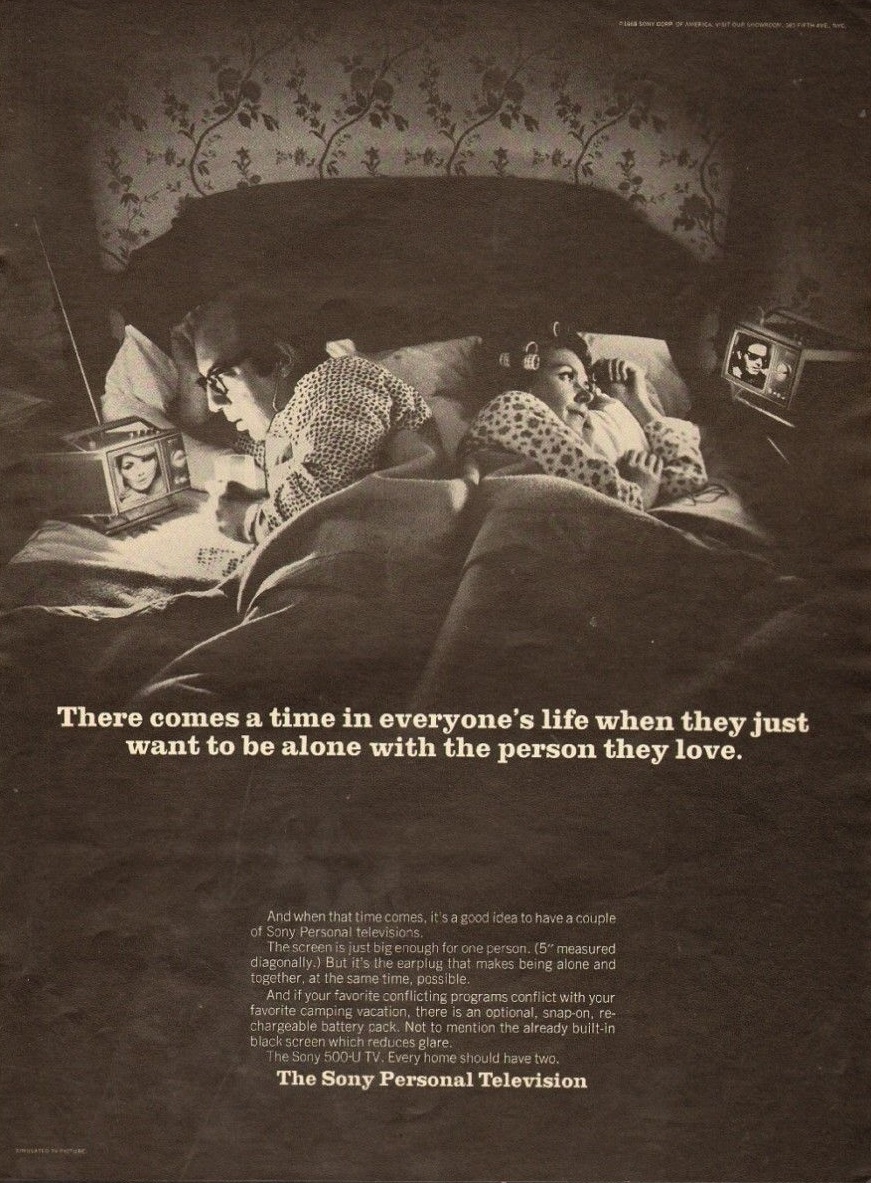 “But it’s the earplug that makes being alone and together, at the same time, possible…” It’s a very hollow definition of “together” that becomes hollower as the gadgets proliferate.