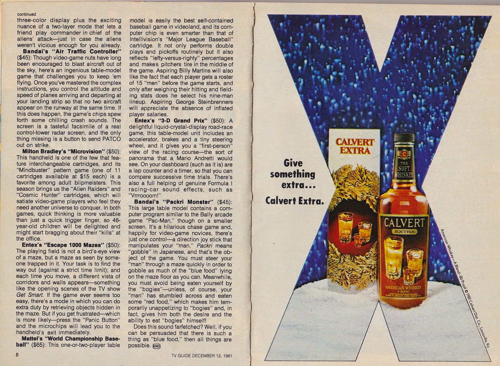 Last year I posted TV Guide’s “Best Video Games of 1982,” by Len Albin. Thanks to Tom at Garage Sale Finds, we now have the 1981 edition by the same author. Lots of handhelds listed here, including Galaxian 2, a great game from Entex that allows one person or head-to-head play, with one of the players controlling the dive-bombing aliens.