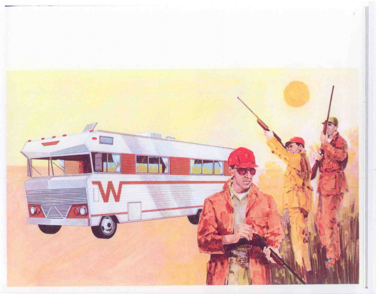 I’ve included all the major illustrations from the ’69 brochure, including the beautiful cross-section. The full PDF is here. Starting in 1970, illustrations are largely abandoned in favor of photos. Notice how all walks of life are included in the larger Winnebago family: retirees, couples with and without kids, sportsmen, swingers, golfers. A commitment to individualism and a roving spirit are all that’s needed.