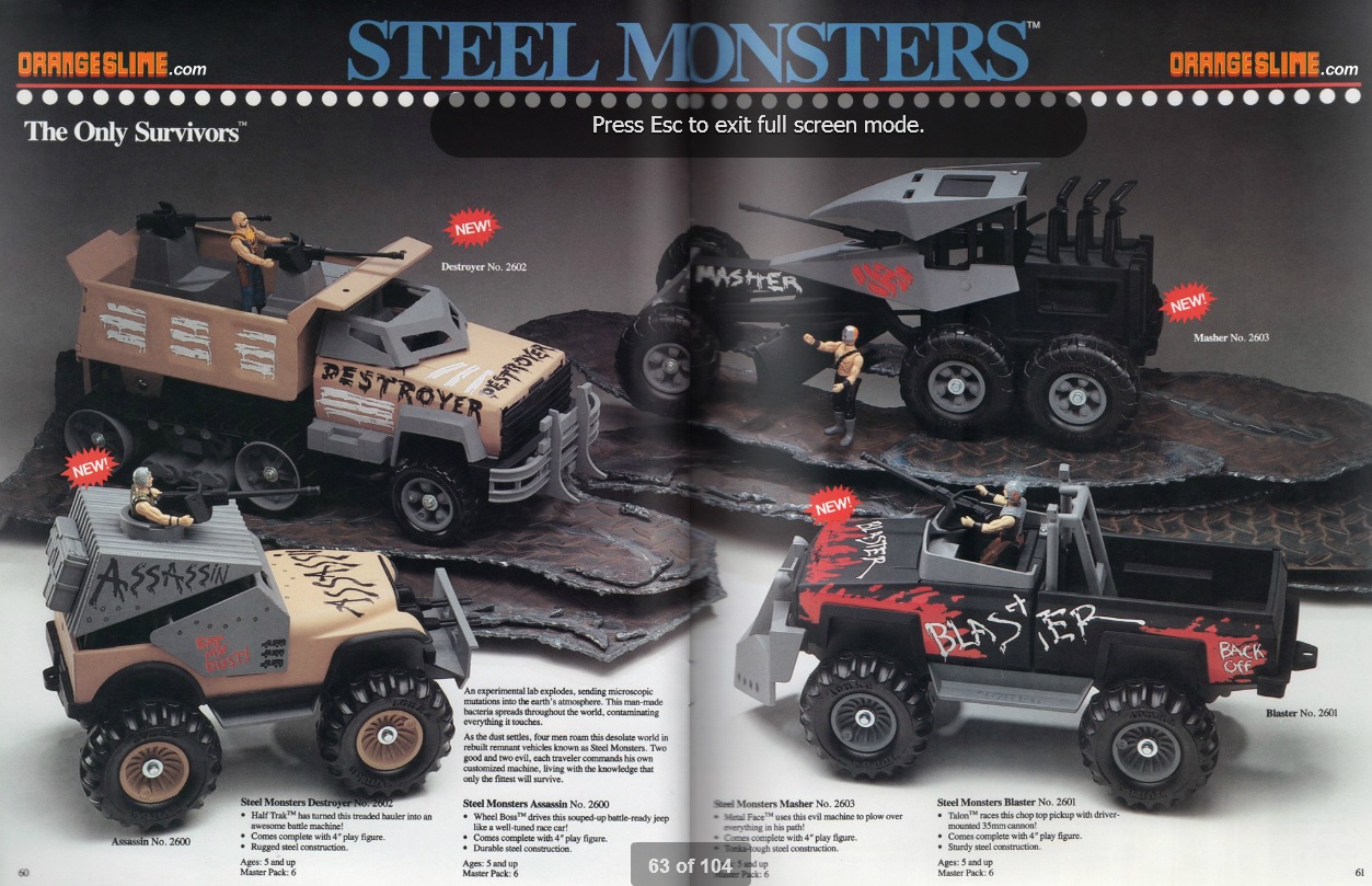 Thanks to Warpo, I now know these post-apocalyptic-themed, Mad Max-inspired toys exist. Billed by Tonka as a “male-action survival” line for “older boys” and following the release of Mad Max: Beyond Thunderdome (1985), it was a good shot, if a misfire (profit-wise), by Tonka. The post-nuke trope was in high gear in film, comics, and especially neo-pulp novels at the time, but I would say the concept appealed mostly to boys older than the 5-10 age range Tonka was targeting.