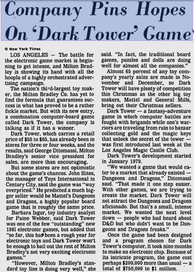 We wanted a game that would cater to a market that already existed—Dungeons and Dragons… Dark Tower will not attract the Dungeons and Dragons aficionado. But that’s a small, intense market. We wanted the next level down—people who had heard about D&D but who didn’t want to be Dungeons and Dragons freaks. [Italics mine]