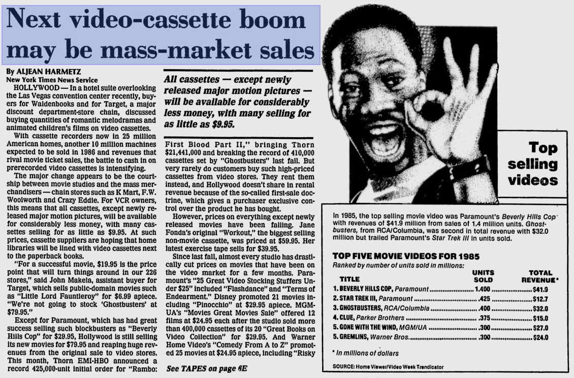 In fact, Ghostbusters set a record for first-day sales (400,000 units), beat the following year by Rambo (425,000 units), although both Beverly Hills Cop and Star Trek III, also priced at $29.95, went on to beat Ghostbusters in total year sales. Check out the February 1986 Gainesville Sun article below for some interesting figures.