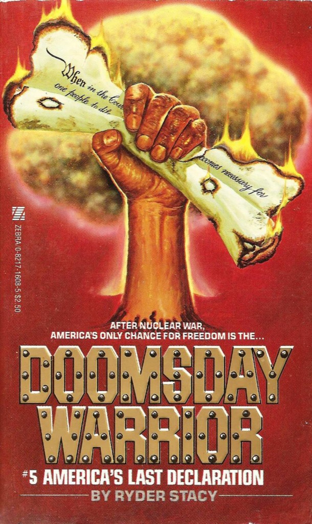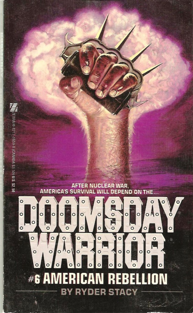 The cover design of the Doomsday series—with the defiant fist and forearm doubling as the stem of the mushroom cloud that ended the old ways—is magnificent. The writing is not. From #7, American Defiance: