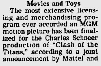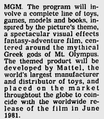 Mattel was the “primary target” for MGM’s massive, and very successful, marketing campaign for Clash of the Titans. The film was panned by critics, but ended up the 11th highest grossing feature of 1981. Here’s a snippet from the Schenectady Gazette (August 30, 1980) describing the merchandising, apparently the “most extensive… ever accorded an MGM motion picture.” (There’s also an interesting December 1982 article here about the dangerous business of toy licensing: Mattel’s Clash line is noted as one of the “bargain-basement items.”)