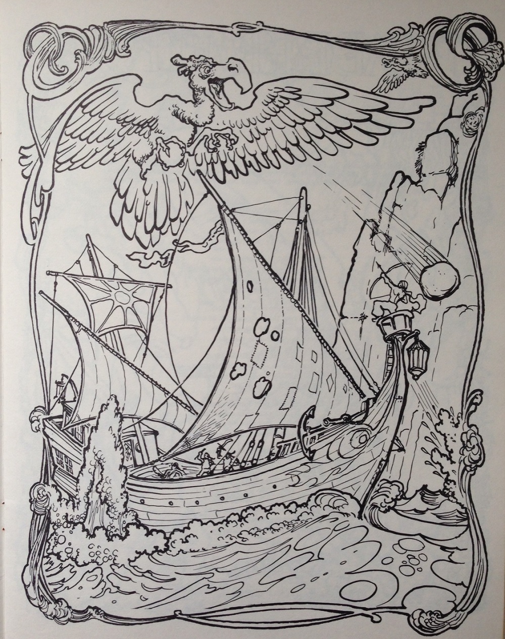 As we were discussing which tales to include in the book, I was astounded by Larry’s depth of knowledge of great fantasy authors and realized that he had to write the book as well as illustrate it. Tales of Fantasy has more text than most of the other Troubador coloring albums.