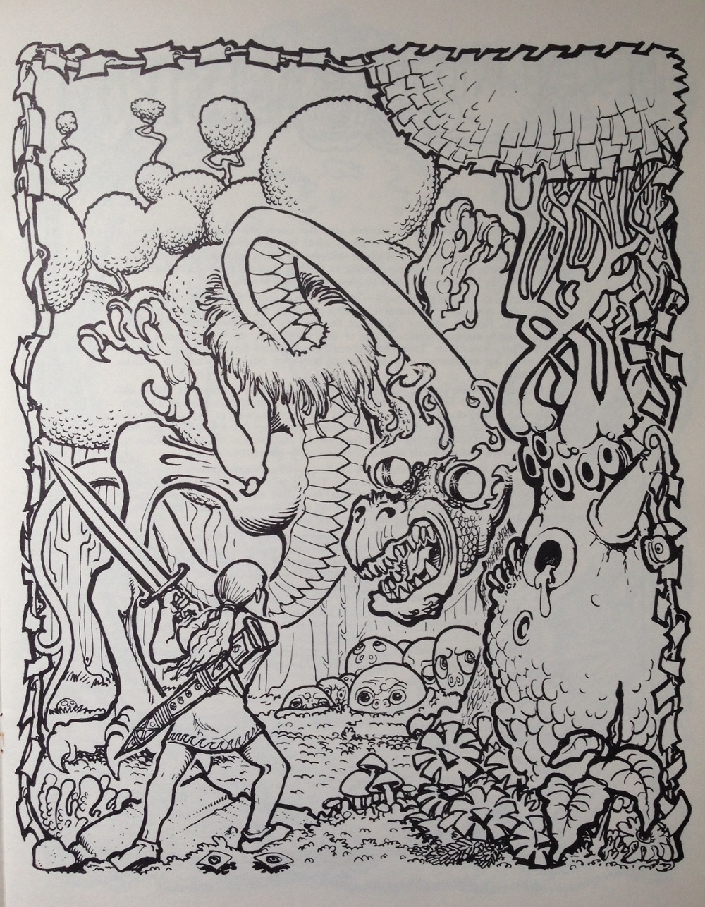 I admired Greg Irons’ art that he did for the underground comix. He had a strong sense of composition and was great with monsters. He enthusiastically agreed to illustrate AD&D. Greg was not only a thoroughly professional artist (he spent a couple of years in London working on the Beatles’ Yellow Submarine feature), but an easygoing, sweet man. His powerful visualizations of the AD&D monsters and their world really brought them to life. Larry Evans, who was art director for Troubador, worked with Greg on the book, pointing out Greg’s subtle sense of humor by noting: “he’s the only person I know who has a tattoo that says ‘tattoo’ on his arm.” He was a glorious guy.