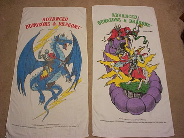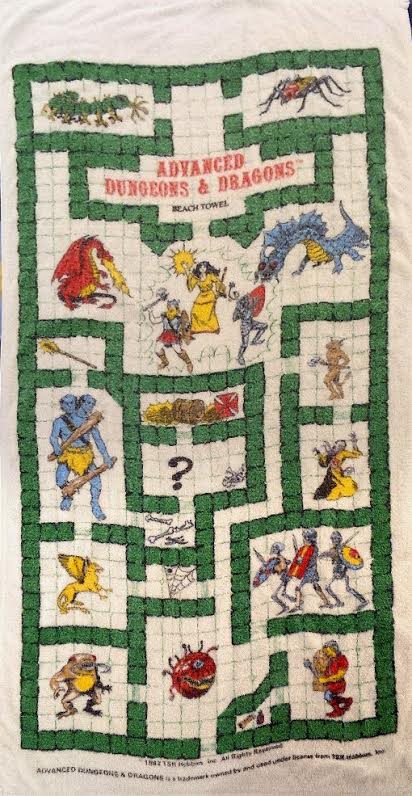 Because if there’s two things that go together, it’s AD&D and the beach. And the towels must be used at the beach, because “beach towel” is printed right there at the top. Try not to lose your dice in the sand, gamers.