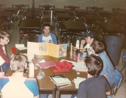 Via Joey Hack/Flickr. Location not given. I spy with my little eye not one but two briefcases (one of them doubling as a DM screen), a Champion vest jacket, a reel-to-reel tape machine, a turntable, a black cowboy hat (DM’s prerogative), carpet wall art, and I do believe that’s an open carton of cigarettes on the ashtray on top of the TV. Kid in blue is holding Milton Bradley’s MicroVision, the first handheld video game console.