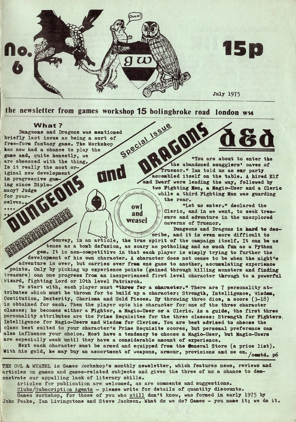 Owl and Weasel (February 1975 to April 1977) was the first Games Workshop newsletter, eventually becoming White Dwarf in 1977. The snippet above, from Owl and Weasel #5 (June, 1975), is probably the first time GW co-founder Steve Jackson mentions D&D in print. He hasn’t even played the game yet, but “watched one in progress the other week at the City University Games Club…”