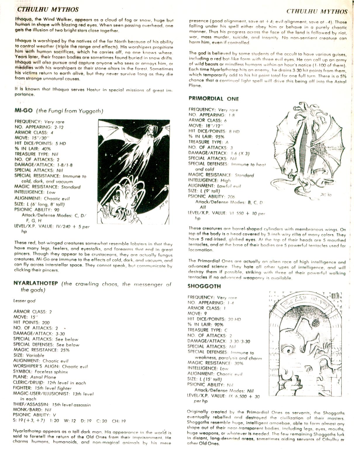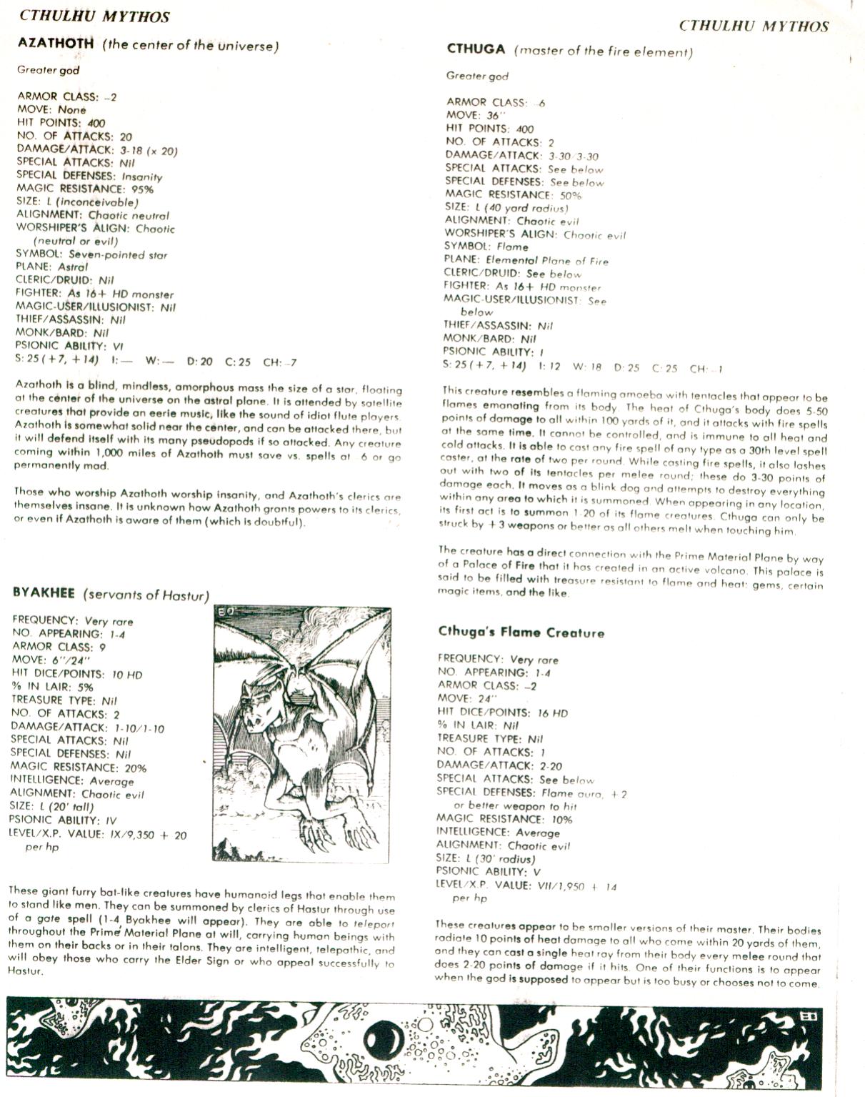 Compare the entries and stats here to the “Lovecraftian Mythos” article in The Dragon. Despite J. Eric Holmes blowing off a reader’s suggestion to raise the hit points of the Great Old Ones, that’s exactly what’s happened—and a number of other criticisms have been addressed as well. My favorite part of the Azathoth entry—about the universe collapsing and all life being destroyed in the event of the creator’s death—has been removed, and instead of being “the creator of the universe,” Azathoth is now “the center of the universe.” The idea is to make the gods appropriately awesome and intimidating while also making them approachable from a role-playing perspective.