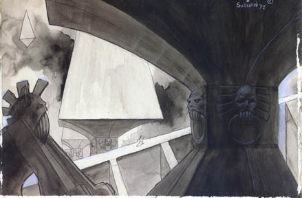 SULLIVAN: I met a magnificent dreamer and one of the to-be producers, Bill Baetz, at the Jackson (Michigan) Space Museum. There was an event that featured J. Allen Hynek of the U.S Government’s Project Bluebook (UFO research organization) fame. Close Encounters of the Third Kind was being released and Professor Hynek was on tour and, being fascinated by UFOs, I had to attend. Bill was working at the Museum and I met him after the presentation. We got to talking about movies and I told him about my artwork. And that set it off. Bill Baetz and David Hurd (a.k.a. Byron Craft) were preparing to make a horror film based on the writings of H.P. Lovecraft. Dave had a script and my job was to illustrate production designs to help promote the film. I was happy to join in. The story was based on the cosmic Lovecraft—not a strange and foul family living outside of town, but portals to terrifying dimensions and journeys to Unknown Kadath. I was new to Lovecraft, so off I went to local used book stores to educate myself on the Cthulhu Mythos.