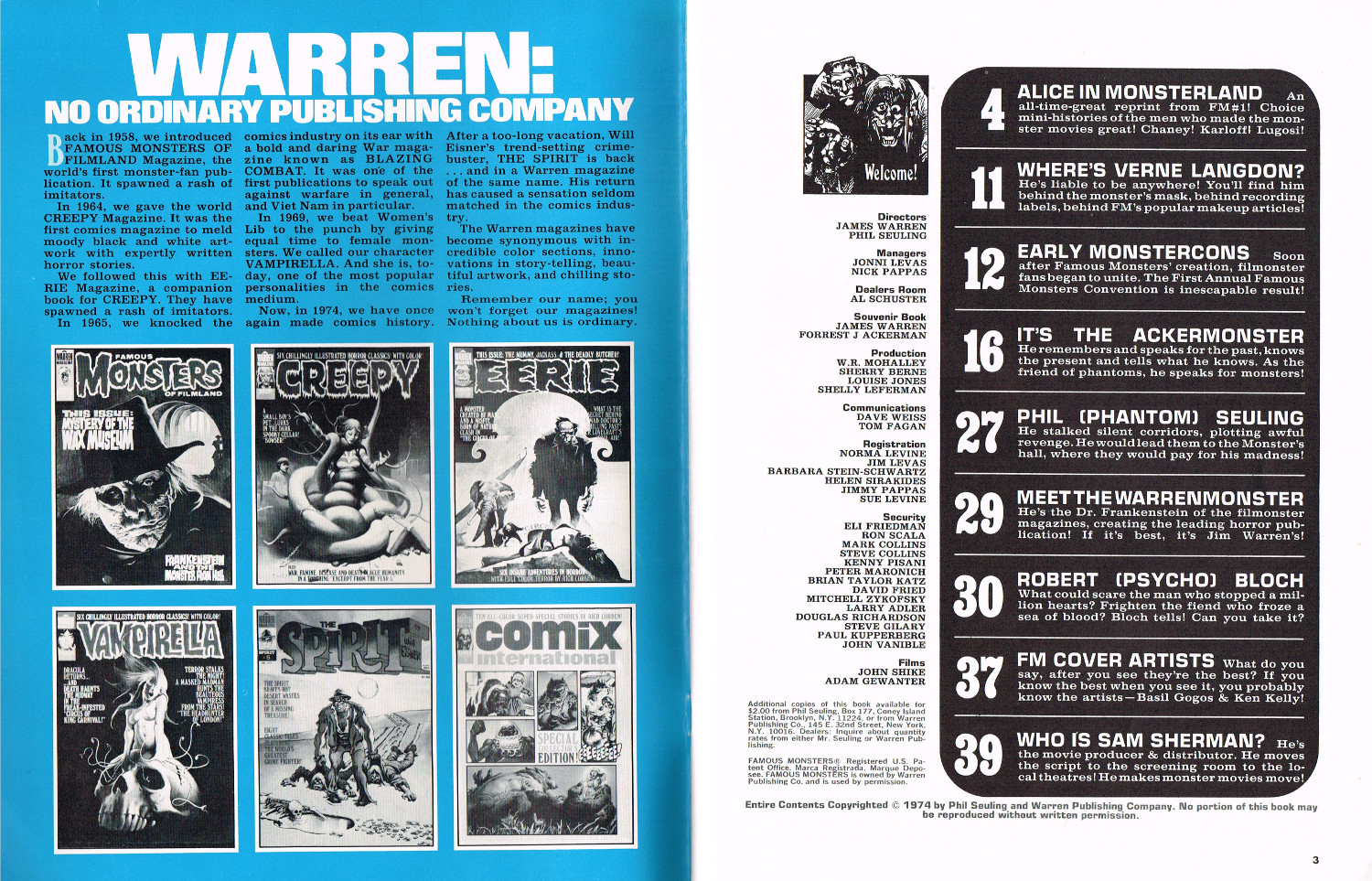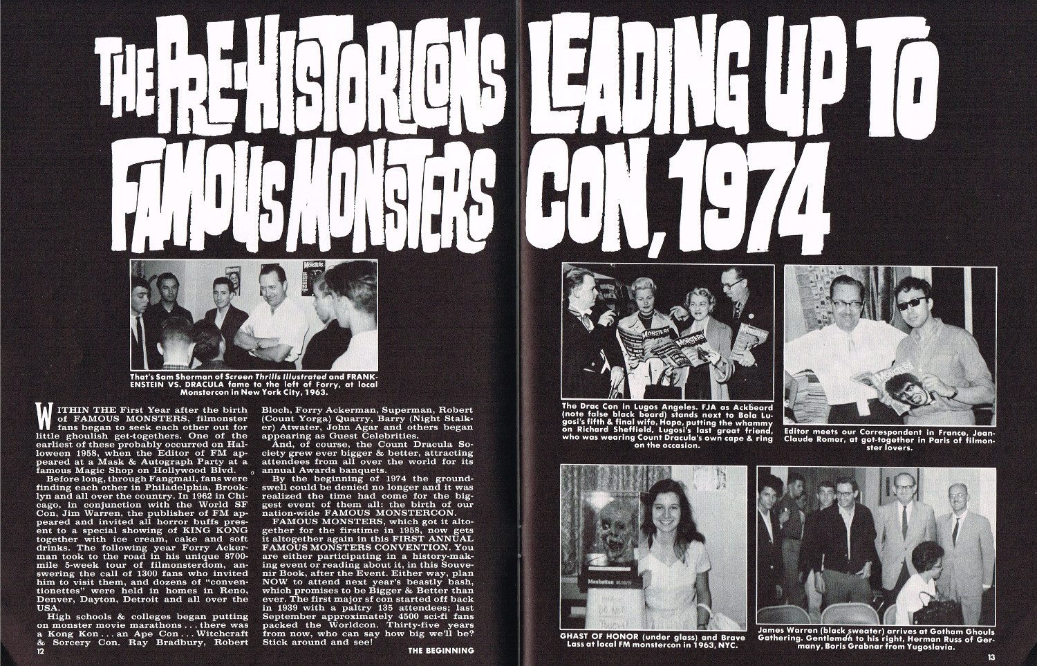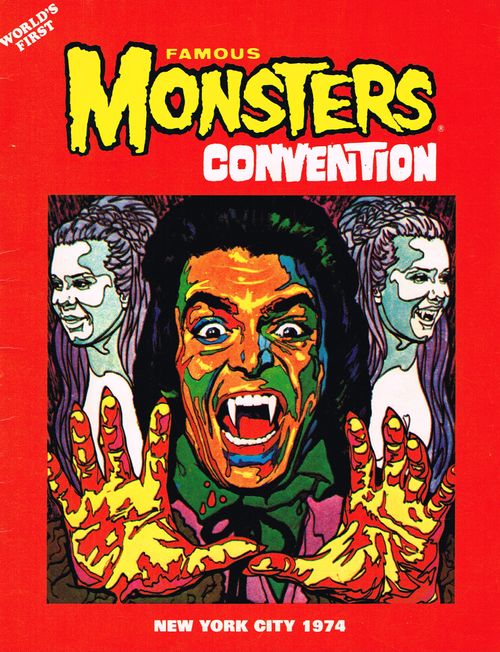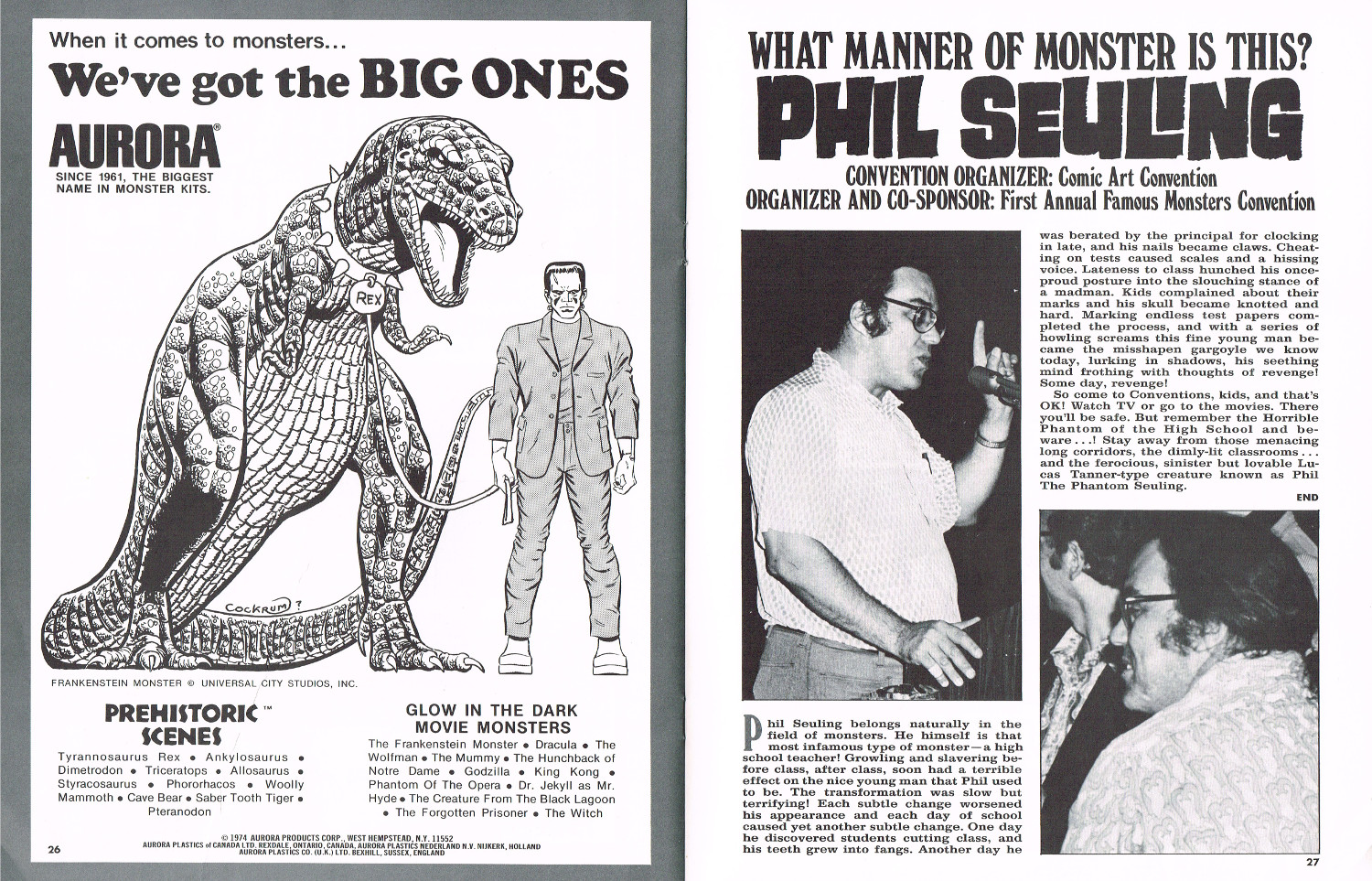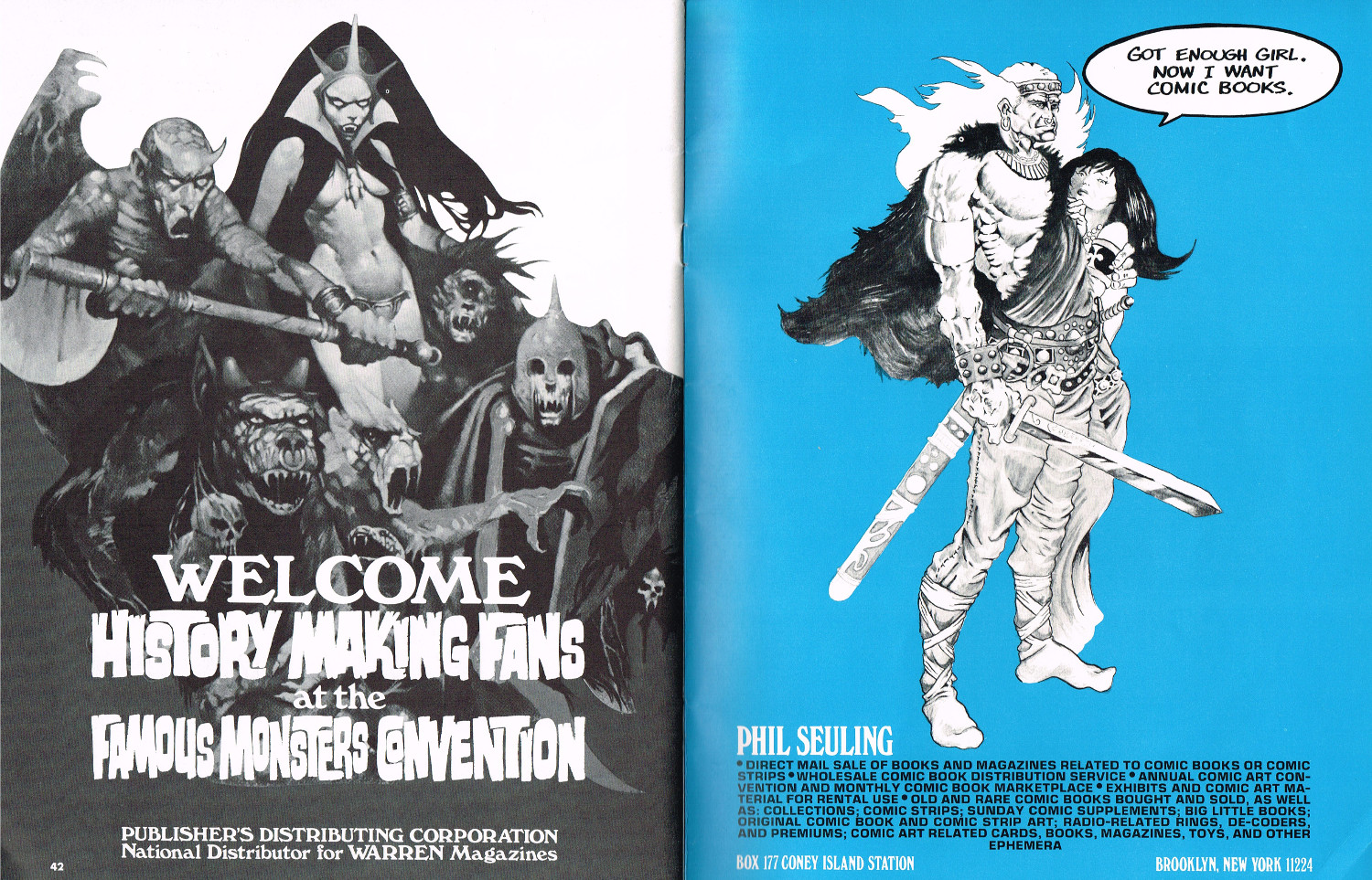 Chock full of history about monsters and monstercons, Forry Ackerman (check out his office in the fourth photo down), Phil Seuling (early con organizer who developed the direct market distribution model), and James Warren, not to mention some glorious art and ads, you can read the whole program at From Zombos’ Closet, a terrific monsterkid blog. Also check out the equally interesting 1975 Famous Monsters Convention Program.