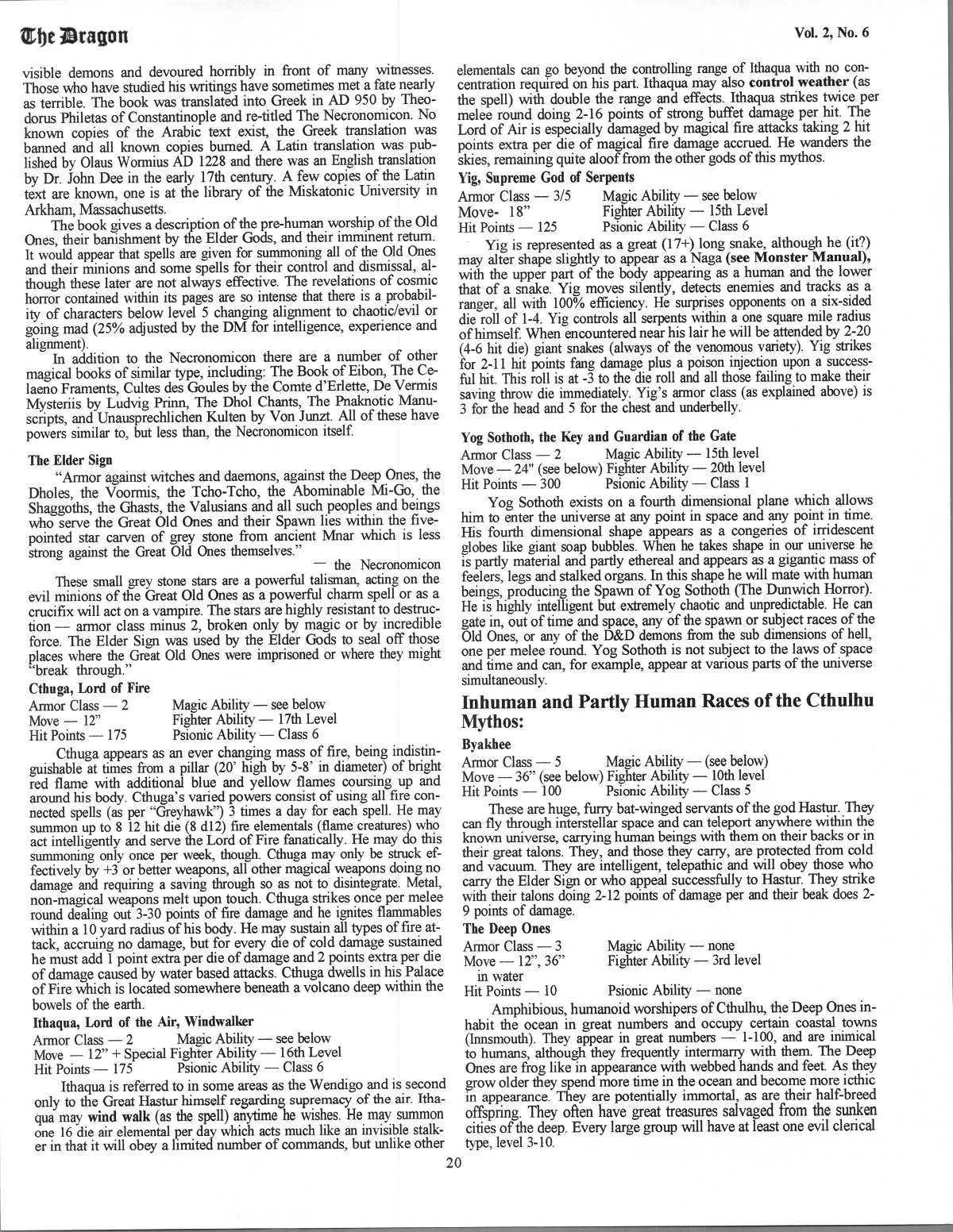 A “Cthulhu Mythos” section (see tommorow’s post) expanded from the Dragon article appeared in the first edition of Deities & Demigods, but was famously removed from subsequent editions because TSR didn’t want to acknowledge its debt to Chaosium, which had acquired the rights—or the blessings of Arkham House, anyway, since Lovecraft’s works were and are in the public domain—for the Call of Cthulhu role-playing game.