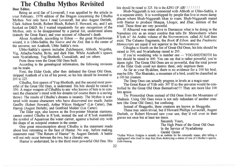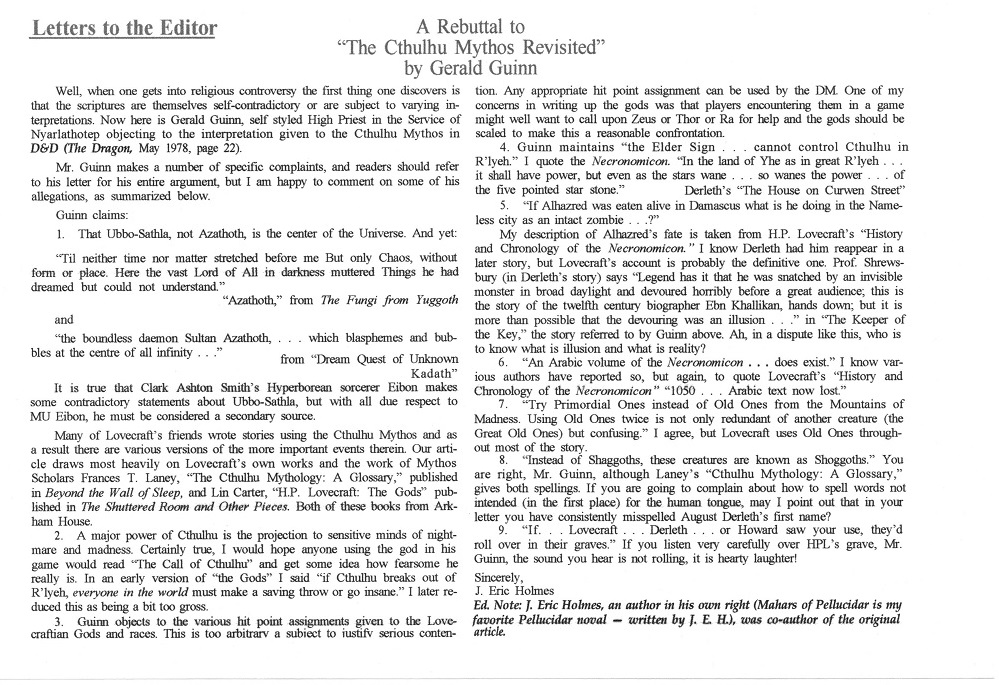 In The Dragon #14 (May, 1978), a letter from reader Gerald Guinn cheekily objected to a number of points made in the “Lovecraftian Mythos” article. J. Eric Holmes cheekily responded in The Dragon #16 (July, 1978). Both letters are below. Holmes’ response, along with the original article, are listed in Lovecraft scholar/biographer S.T. Joshi’s H.P. Lovecraft and Lovecraft Criticism: An Annotated Bibliography (1981).