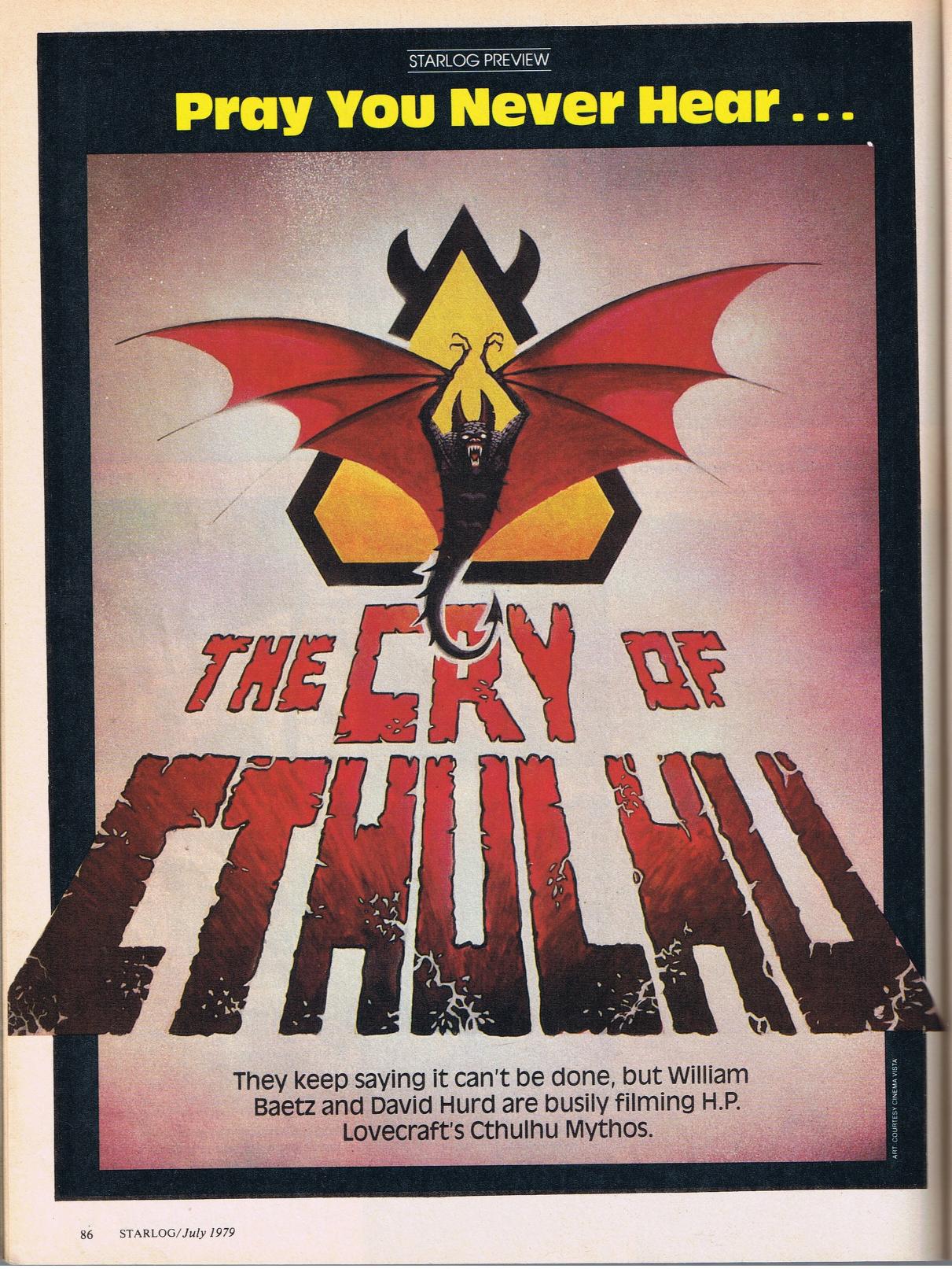 The Cry of Cthulhu was supposed to be something of a sequel to Lovecraft’s The Shadow Out of Time. I don’t know specifically why the project fell apart, but I imagine it was a combination of money and studio cowardice. Based on an earlier blurb in Starlog #6 from 1977 (below), the film was initially a low-budget affair to be shot entirely in Michigan.