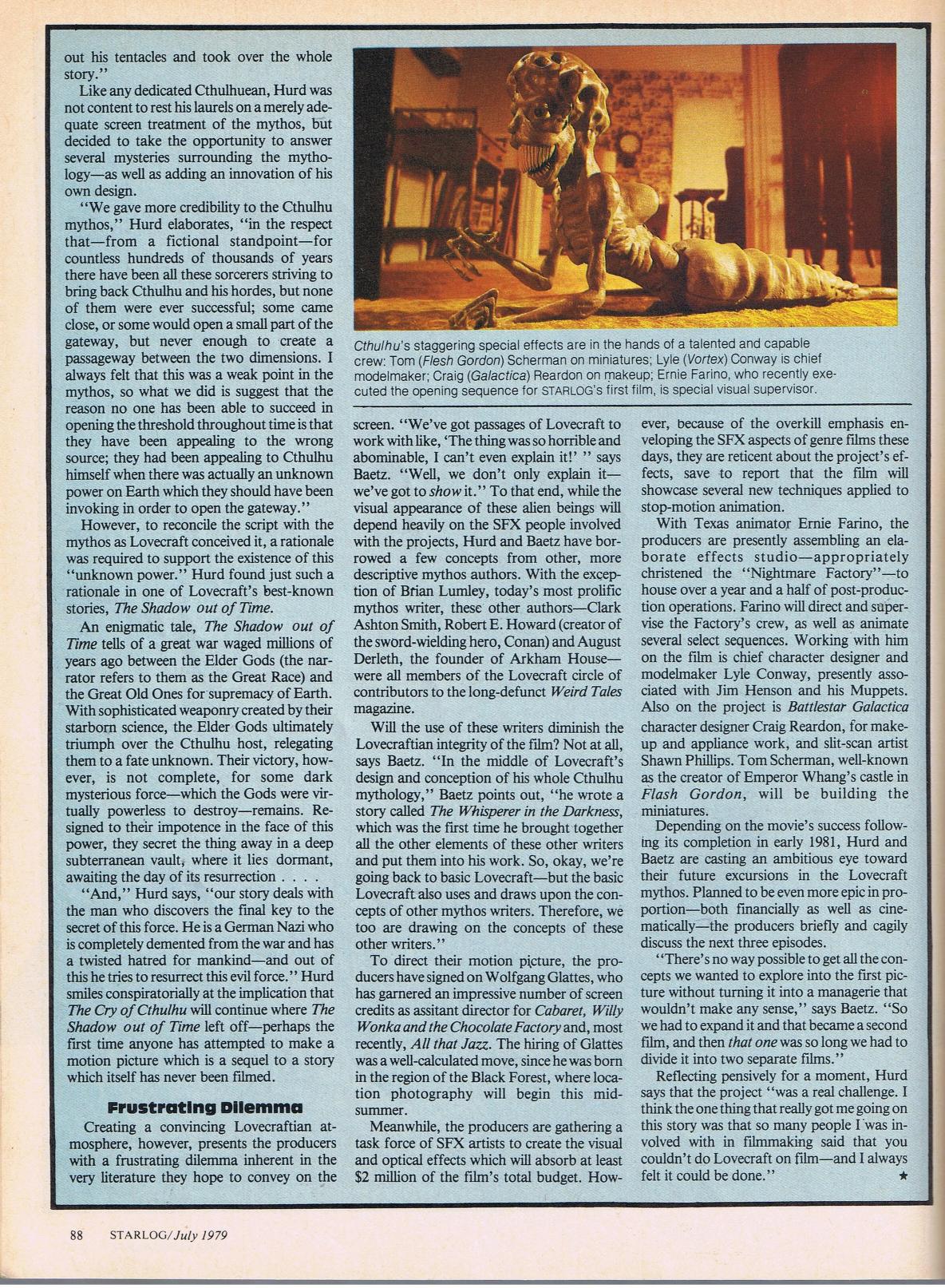 The article is from Starlog #24 (July, 1979). The “lost” Lovecraft movie reportedly secured a $7 million budget, received the blessings of Arkham House (Lovecraft’s longtime publisher and champion), and was slated to “showcase several new techniques applied to stop-motion animation.” What makes it so much more interesting is the special effects talent lined up for the project.