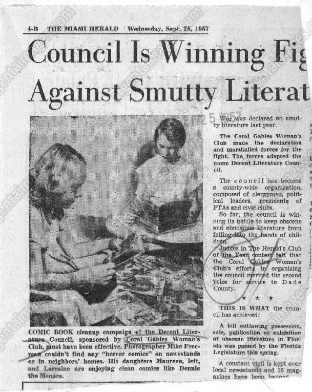 The Decent Literature Council, established in 1956, was active well into the 1960s. Its mission was “to protect youth from obscenity and pornography.” Here’s one of the directors, from a 1961 Miami News story: