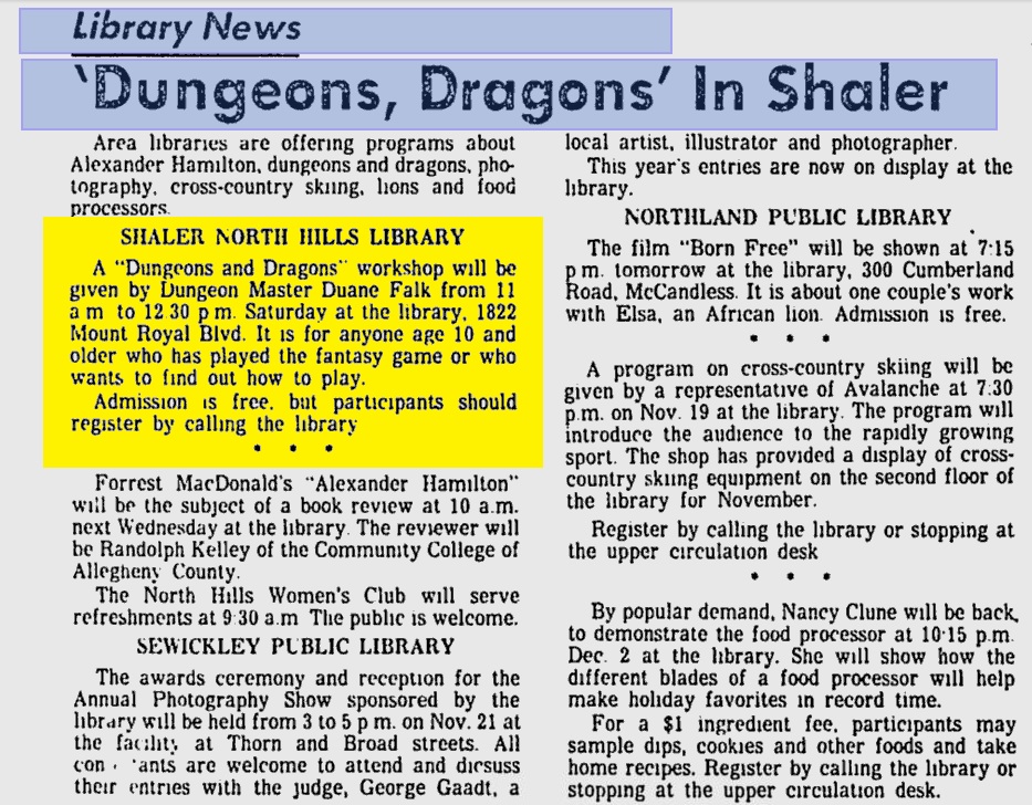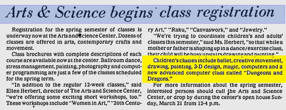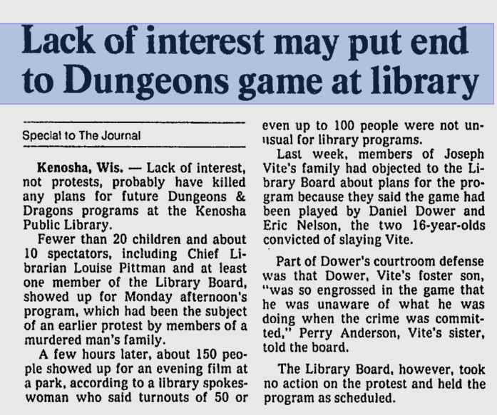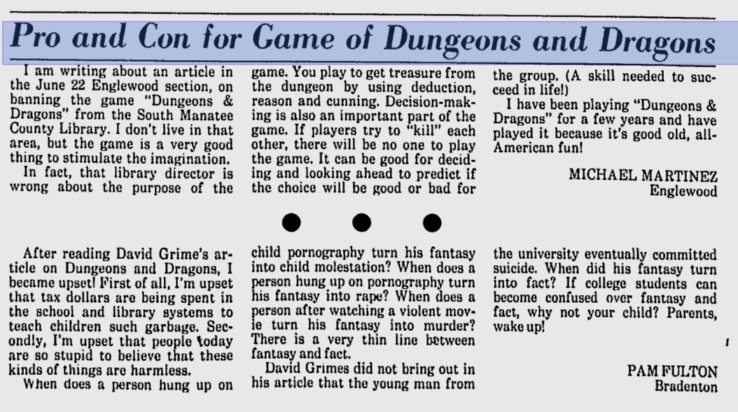 ***See the AP article “Dungeons, Dragons: Fundamentalists Attack Game as Road to Occult” from February 27, 1982. The writer of a letter to the editor in the December 12, 1980 edition of the Eugene Register-Guard calls D&D a “new fantasy game… based on the ability to promote demons to wipe out the opponent through information and formulas that could only be written by someone well versed with the occult.” She also calls the game an “introduction to the occult.” A December 1981 Milwaukee Sentinel article talks about the school board of Mukwonago High School approving Dungeons & Dragons as an official after school activity. 465 area residents submitted a petition to reverse the decision, calling the game “an active instrument in the practice of witchcraft.”