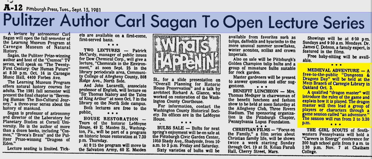 Certainly not an exhaustive list of ongoing D&D events sponsored by public institutions, but the narrative told in just these few cases is interesting enough. (I’ve mentioned D&D in science museums here and here). In the midst of all the nonsense spouted about the game, most adults managed to keep an even head about it. My parents didn’t understand how it worked or why I found it so enthralling, but they trusted me enough to let me play, and, if I felt it was necessary, to stop playing.