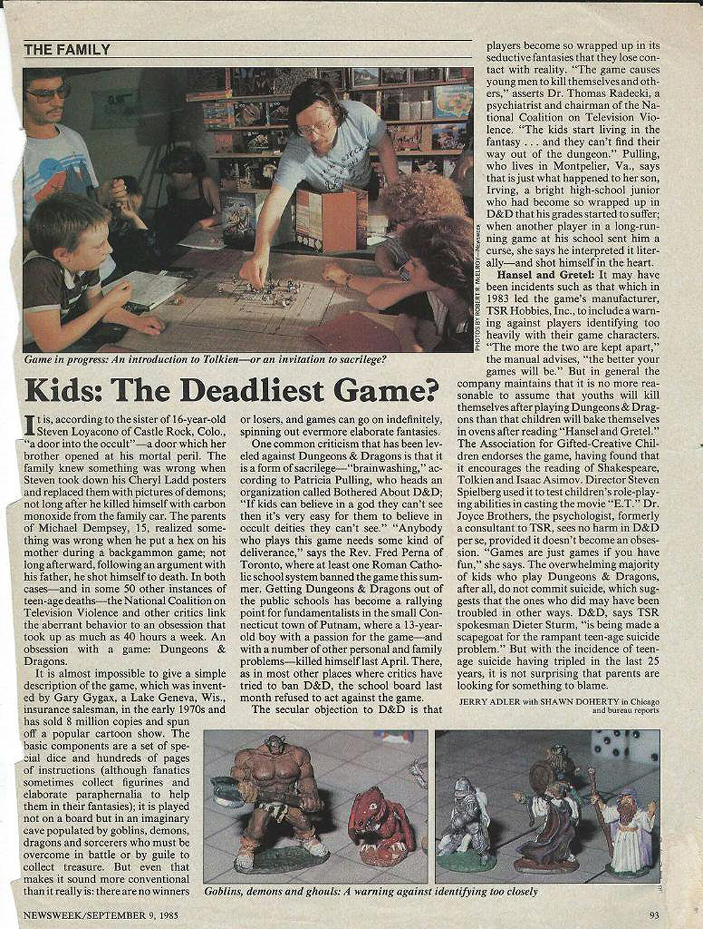 Zach at Zenopus Archives pointed me to a recent Newsweek piece about a 1985 letter to the editor written by a very level-headed 12-year-old named David Bobzien. The letter defended role-playing games against the sensationalist article above (via Furiously Eclectic!), which blindly pounds all the panic buttons of the time—“fanatics sometimes collect figurines and elaborate paraphernalia to help them in their fantasies,” etc. Only in the last paragraph does it offer some faintly positive words about the hobby and D&D in particular. The 60 Minutes episode attacking D&D would air just a few days after the article appeared.