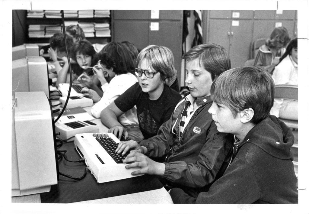 A computer day camp in Chicago, December, 1979. PCs on display include the Apple II, the TRS-80, and the TI-99/4. The latter was brand new at the time. There’s another one I can’t identify to the right of the kid raising his hand. It looks a little like a Commodore PET.