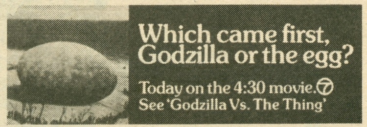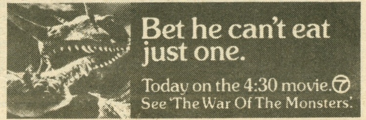 The first ad shows the schedule for February 24th through March 2nd, 1979. The second two ran sometime between 1978 and 1980. Notice the emphasis on “free movie,” indicating the rise of subscription cable at the time. Also, that’s Gamera in the promo for Godzilla vs. the Smog Monster (Godzilla vs. Hedorah, 1971), not the Smog Monster.