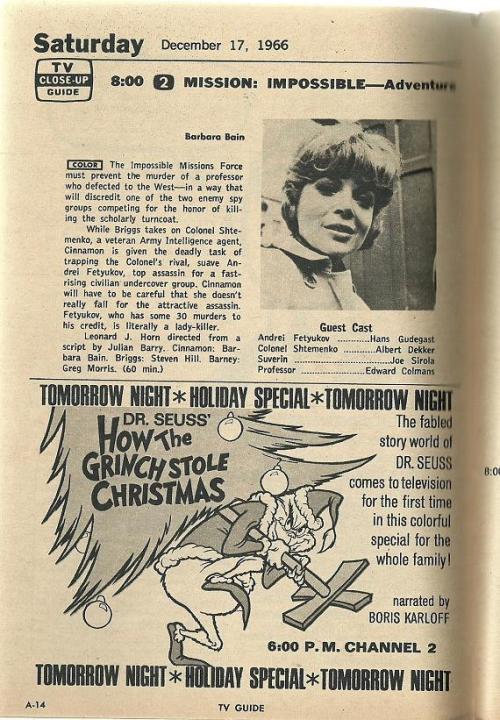 I’d completely forgotten about the TV Guide layout itself, and check out the shows listed on just these pages—Mission: Impossible, Voyage to the Bottom of the Sea, Walt Disney’s World (full title: Walt Disney’s Wonderful World of Color), Wild Kingdom, and the always invaluable Your Astrology Guide. You will never see a description like the following for any TV show ever again: