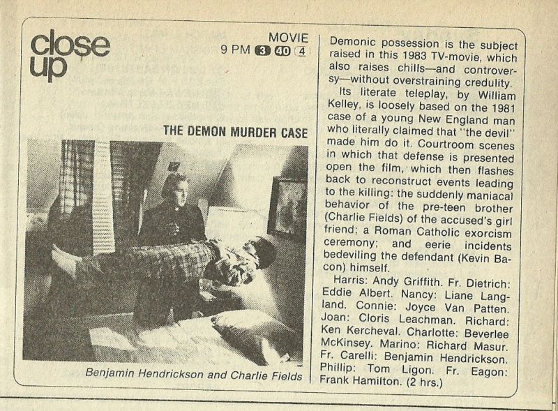 The Demon Murder Case premiered on March 6, 1983. It’s based on the Demon Murder Trial, “the first known court case in the United States of a lawyer claiming his client was innocent due to demonic possession.” The “possessed” killer is played by Kevin Bacon.