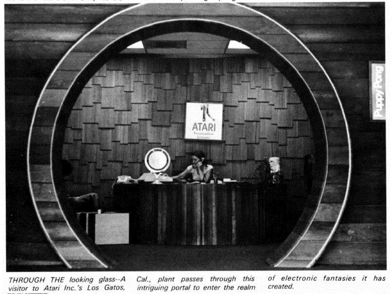 I found this gold at The Golden Age Arcade Historian, a new blog “dedicated to the history of arcade video games from the bronze and golden ages (1971 – 1984).” The photos are from one or more 1975 Play Meter magazines. Puppy Pong—you can see the edge of the poster to the right of the “intriguing portal”—refers to a cutesy table top version of Pong.