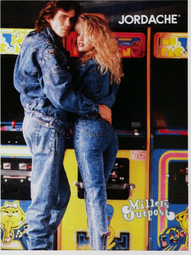 Despite the Pac-Man machines, I put the ad at around ’86 or ’87, when acid wash/stone wash and zippers hit it big with the sort of yuppies-in-training who wore Jordache.