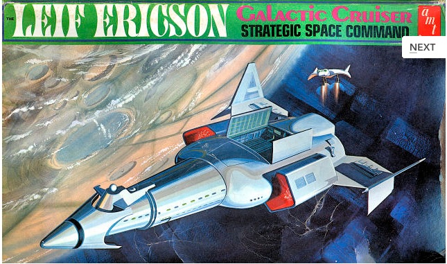 UPDATE: Many thanks to Gordon Peterson, who identified the spaceship model as AMT’s Leif Ericson Galactic Cruiser.